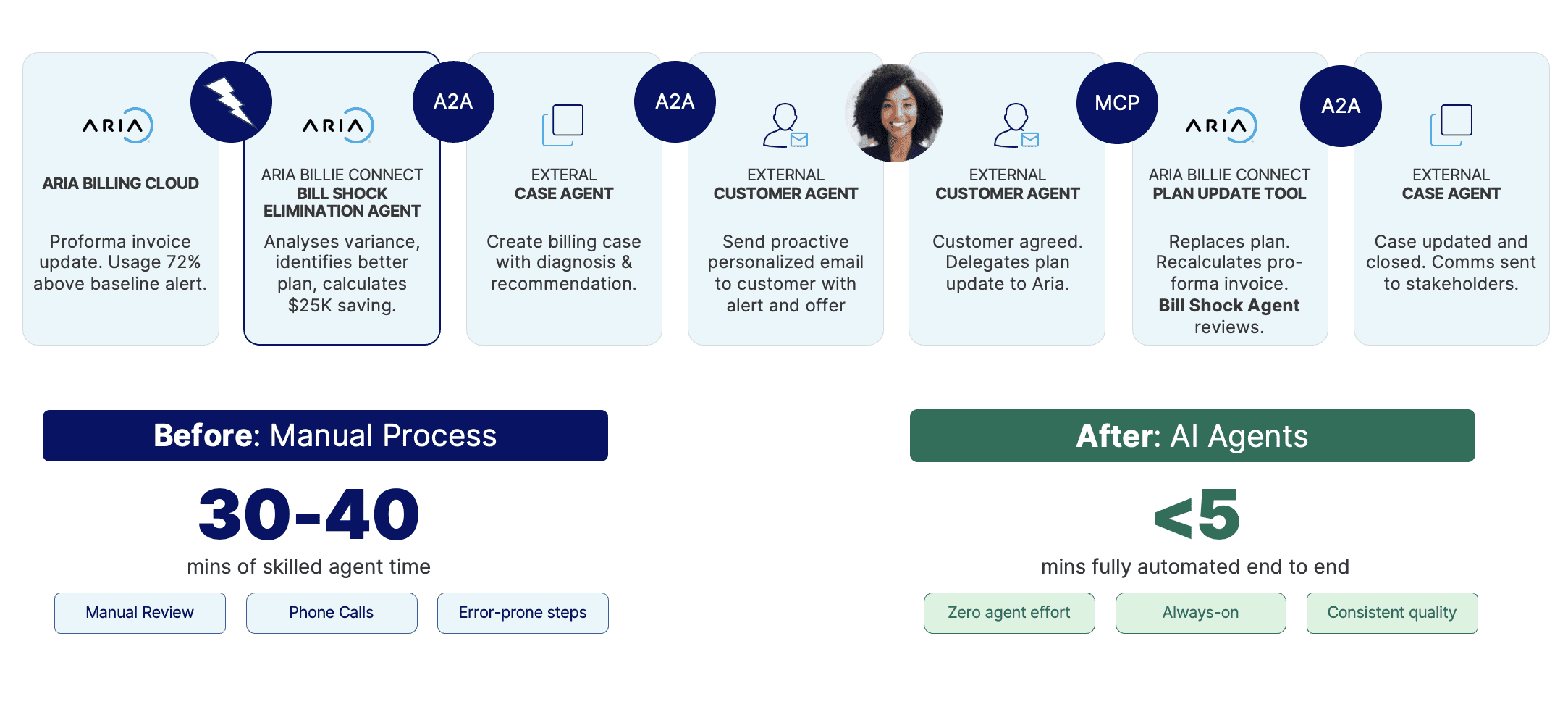 これはAria Billie™の基盤となり、リアルタイムの請求イベントと自律型エージェントを使用して、収益リスクを積極的に低減し、顧客エンゲージメントを強化し、注文から入金、顧客ケアまでのエンドツーエンドのライフサイクルを統括します。